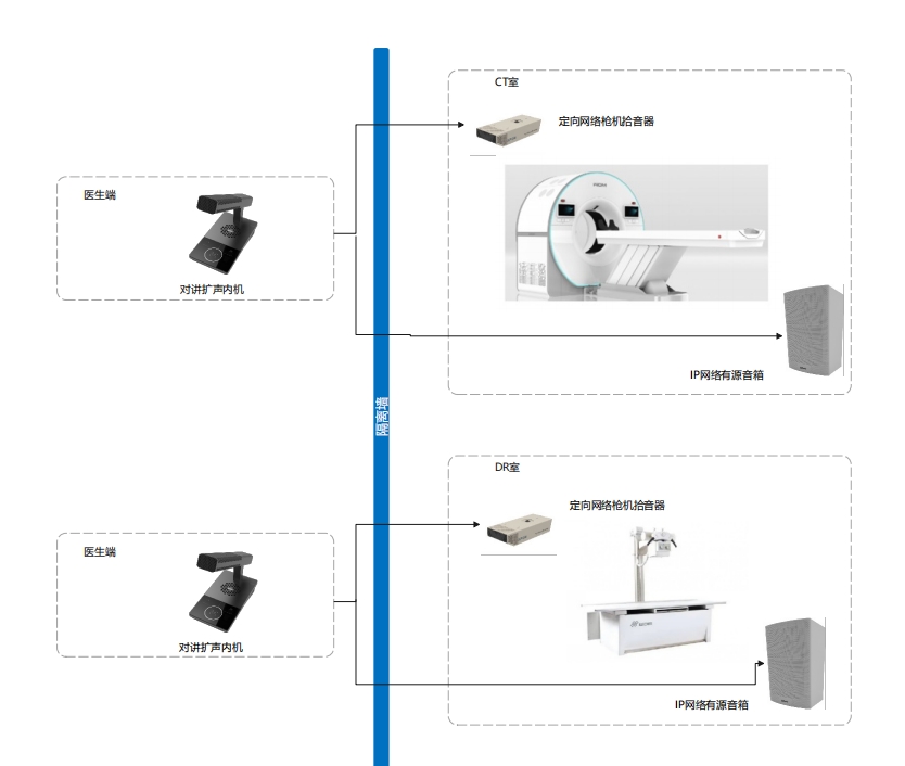 核磁醫(yī)檢對講擴(kuò)聲系統(tǒng)可在高噪聲環(huán)境下使用,具備全雙工對講、主動(dòng)降噪等功能,在核磁醫(yī)檢場景下,可滿足醫(yī)生和患者之間的正常通話交流需求。目前在國內(nèi)多家醫(yī)院的放射科室(CT室、DR室)有應(yīng)用。
