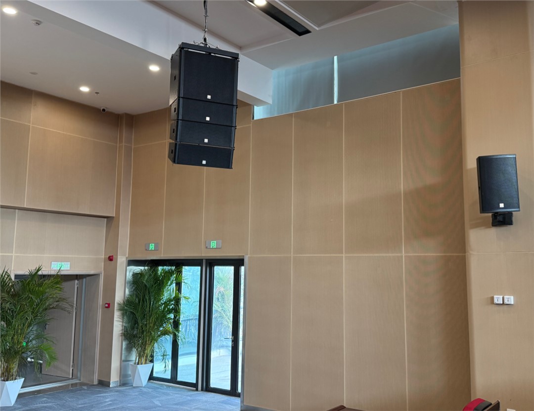 首先,擴聲系統(tǒng)的核心任務是聽得清,設(shè)計需保證整個觀眾席的聲場均勻,堅決避免聲聚焦或聲場死角。通常采用主擴+補聲的分布式聲場布局,以線陣列或大功率全頻音箱作為主擴覆蓋中前場,輔以壁掛音箱覆蓋中后場及兩側(cè)盲區(qū)。在實際吊裝定位時,必須精準計算角度,主擴音箱的輻射范圍切忌直接覆蓋主席臺發(fā)言區(qū),這是引發(fā)系統(tǒng)嘯叫的重災區(qū)。為了保障日常使用的絕對穩(wěn)定,除了在音頻處理器(DSP)中做好系統(tǒng)延時和反饋抑制外,強烈建議對所有發(fā)言麥克風(尤其是高靈敏度的U段真分集或數(shù)字會議話筒)的輸入通道進行壓限處理。這樣不僅能防止演講者突發(fā)性的大聲壓損壞喇叭,也能有效避免給與會者帶來聽覺驚嚇。此外,融入基于IP網(wǎng)絡的音頻傳輸架構(gòu),能夠極大提升布線的靈活性和長距離信號的抗干擾能力。